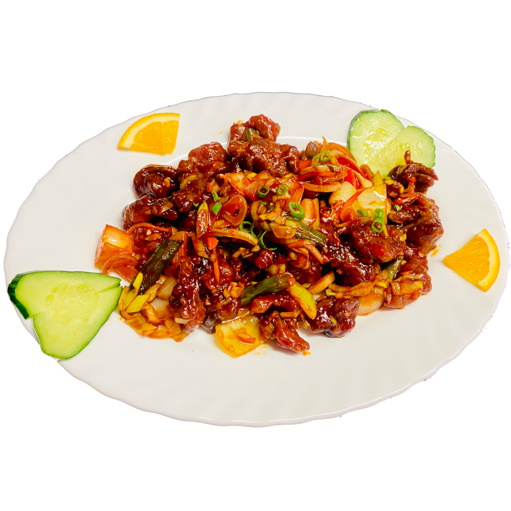 Хрустящая жареная баранина с луком,паприкой,фасолью и перцем чили