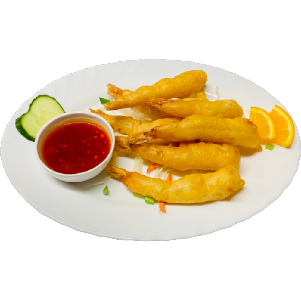 Креветки в кляре, жареные до золотистого цвета с чесночным соусом.