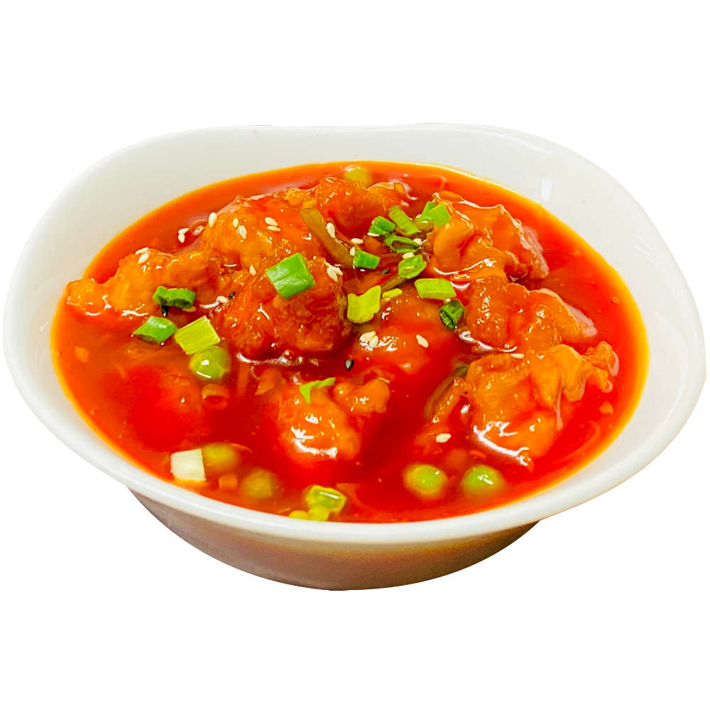 Fried pork with onion, greenpeas, pineapple and carrots served in sweet and sour sauce