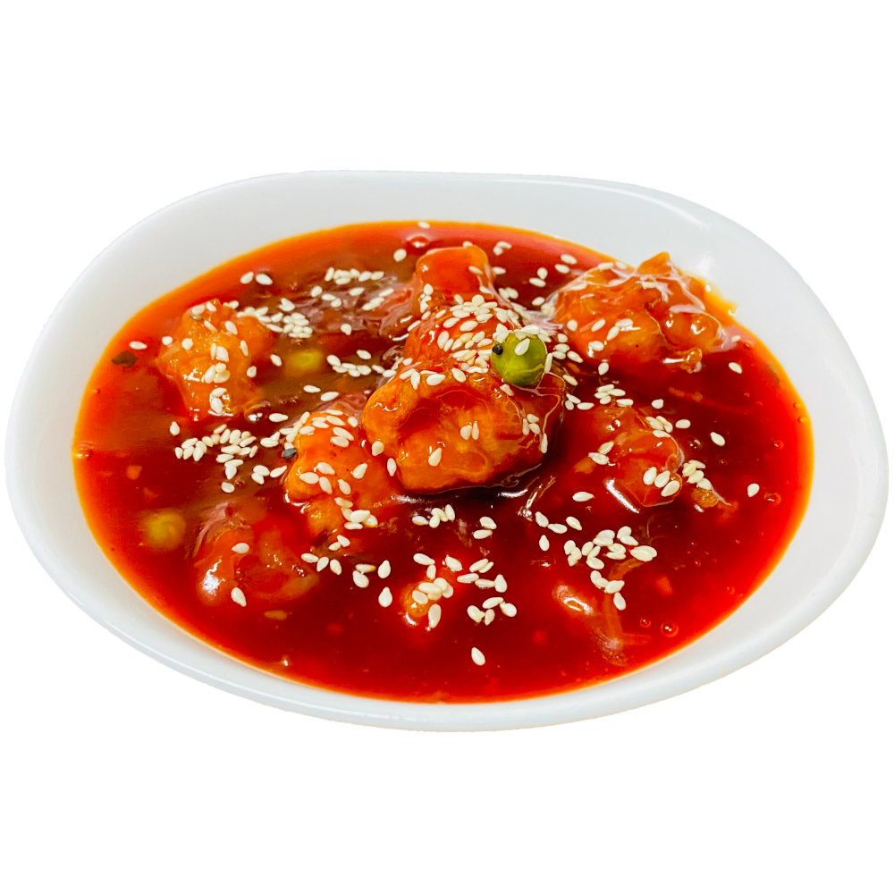 Fried chicken with green peas and sesame seeds in honey sauce