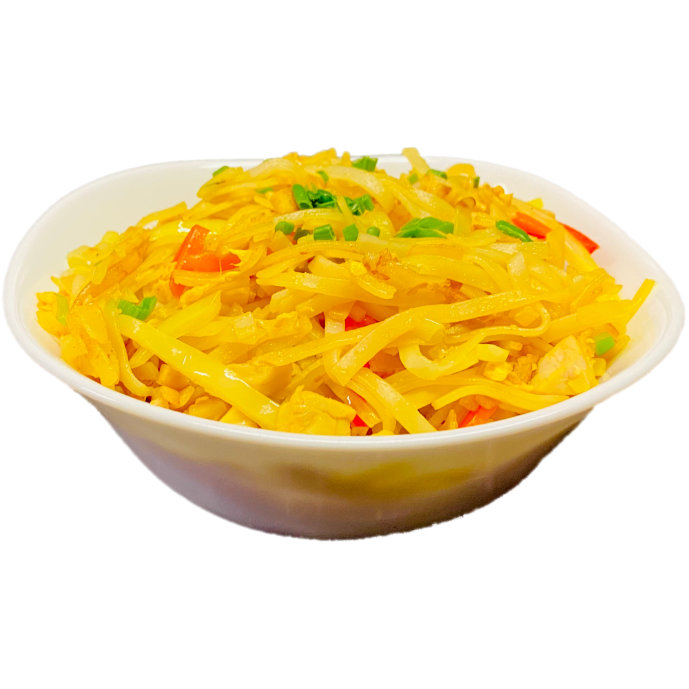 Rice noodles, with chicken, shrimp, egg, curry oil, cabbage, carrots, paprika and green onions